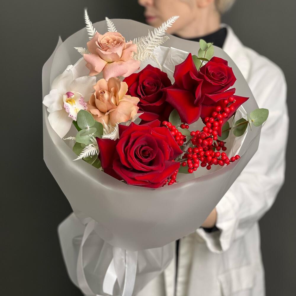 Поздравить любимого человека с помощью стильного и потрясающего букета! Букет выполнен в современной стилистике, каждый элемент букета сочетается друг с другом, настоящее произведение искусства!